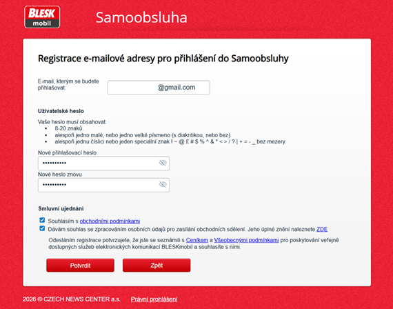 Pro novou registraci e-mailu vyplňte svou e-mailovou adresu, kterou běžně využíváte a klikněte na „Registrovat zadaný e-mail“.