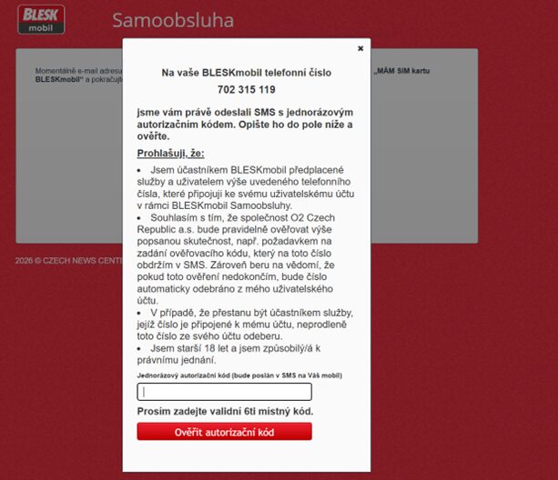 V posledním kroku vložte do pole ověřovací kód, který přijde na zadané telefonní číslo.
